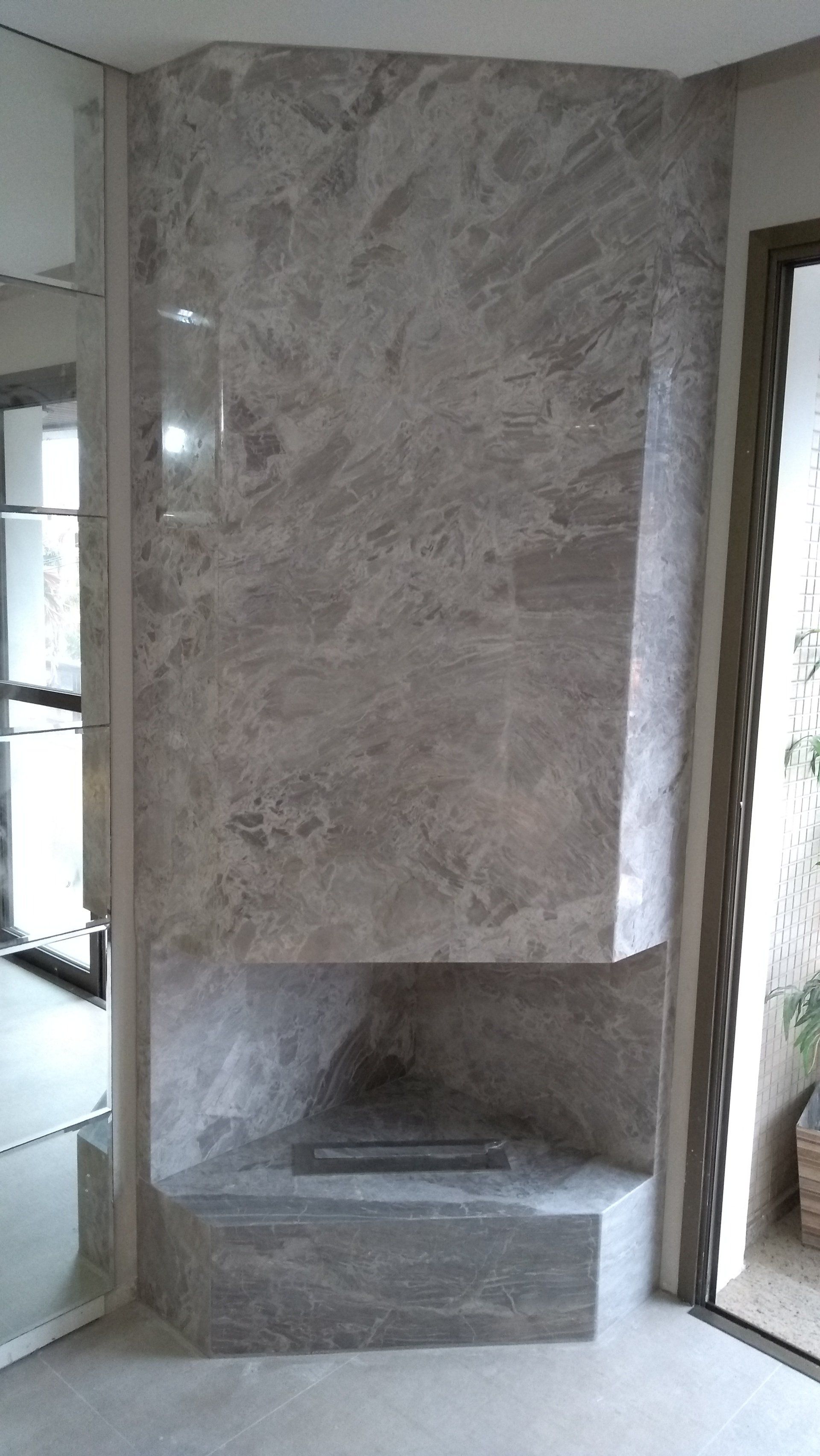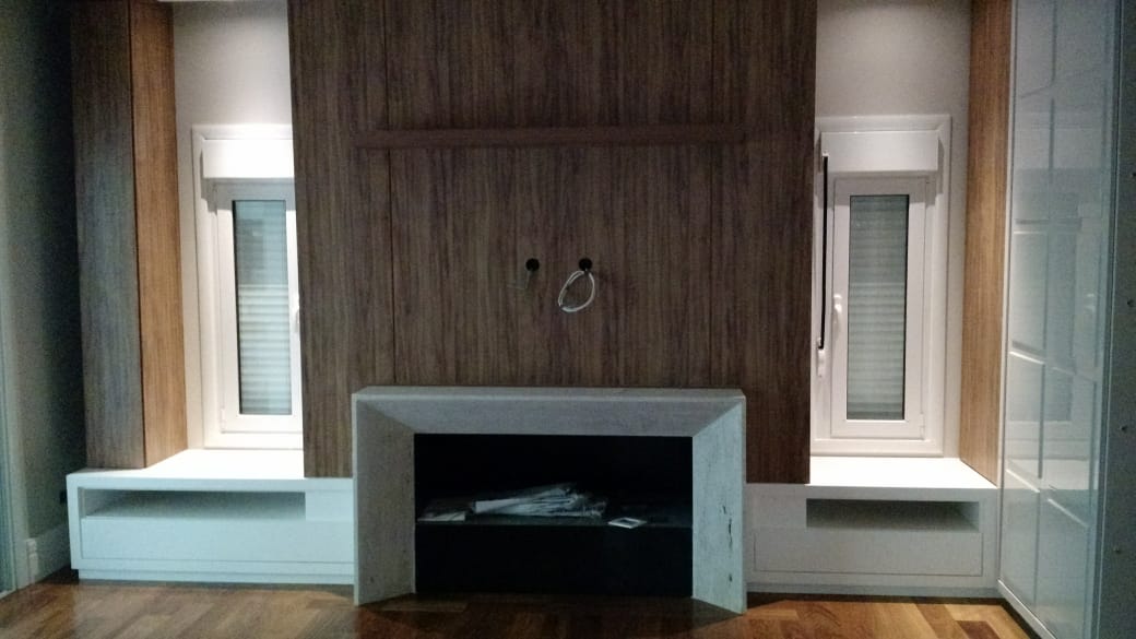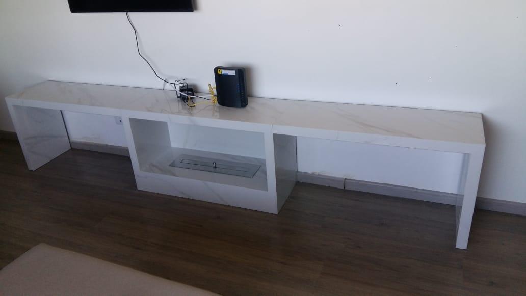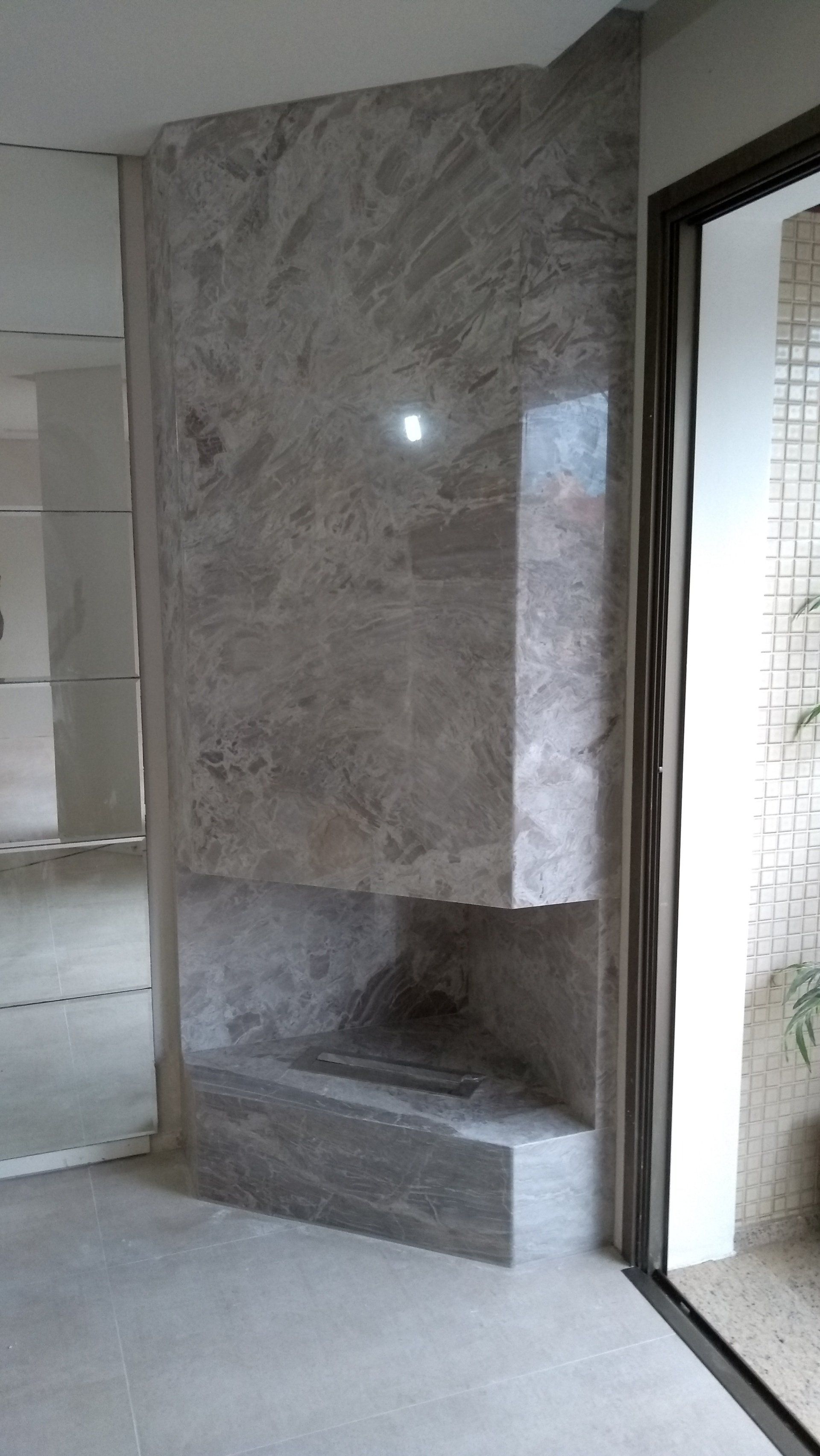 LAREIRA COM EXTENSÃO PAINEL FEIITA EM MARMORE BRANCO PARANA