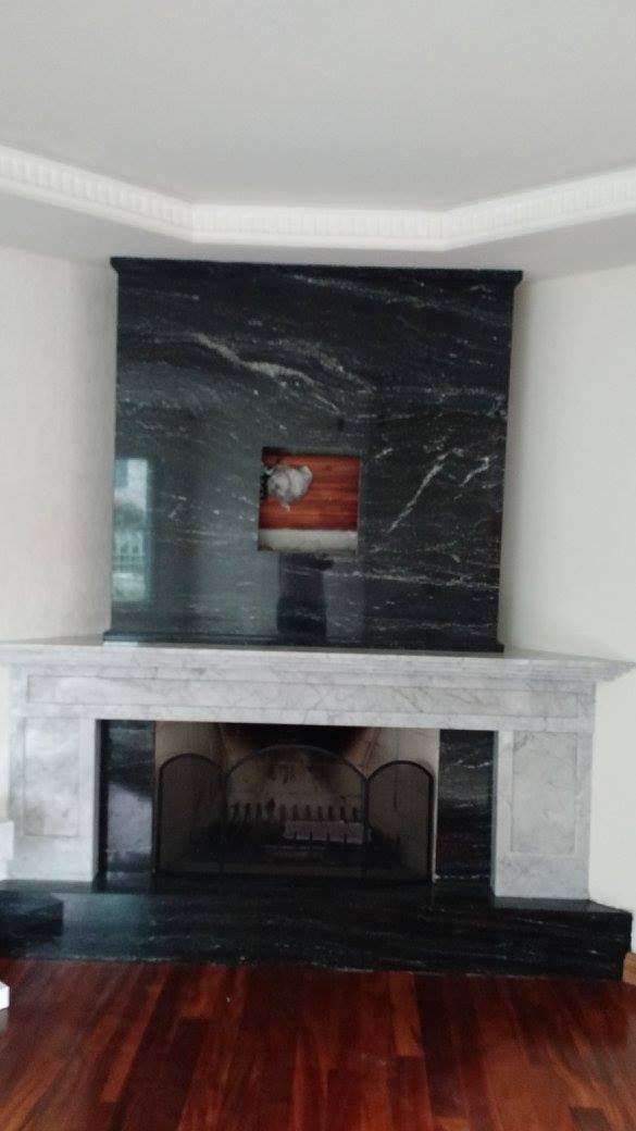 LAREIRA EM MAMORE TRAVERTINO ROMANO E PRETO ABSOLUTO